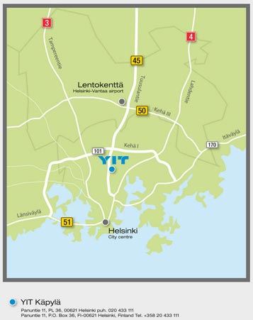 You can reach YIT head office by public transportation. Our head office is located next to Käpylä railway station, where the following trains stop: I, P and K. When arriving by car, please see the parking instructions below.
