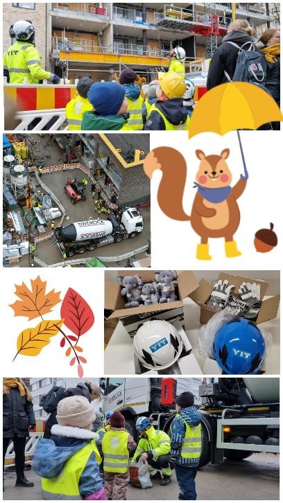 Nyt syksyllä päiväkodista otettiin yhteyttä, josko meillä olisi toimittaa jonkinlaista materiaalia ja rekvisiittaa lasten leikkeihin. Heidän harmikseen varsinaisia rakenteluteemaisia leluja ryhmällä ei ole, ja rakennusteemainen leikkiympäristö on ollut lapsilla toiveissa. Tästä kyselystä lähtikin työmaavierailun ideointi. Toimitimme myös yhteistyössä kohteen tilaajan, Auratumin, kanssa lapsille tarvikkeita rakennusleikkeihin 🧱🦺👷